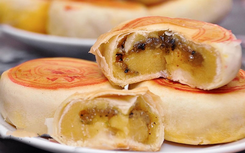Nguyên liệu: Có Bột Mì, Khoai Môn, Đậu Xanh, lòng đỏ Trứng Vịt muối, Sầu Riêng nhưng bánh lại cho hương vị không giống loại bánh nào khác. Hiện nay ngoài nhân Đậu Xanh, Khoai Môn, Sầu Riêng, Trứng muối còn có nhân Hạt Sen, Xá Xíu, Củ Cải, Bơ, Thơm…